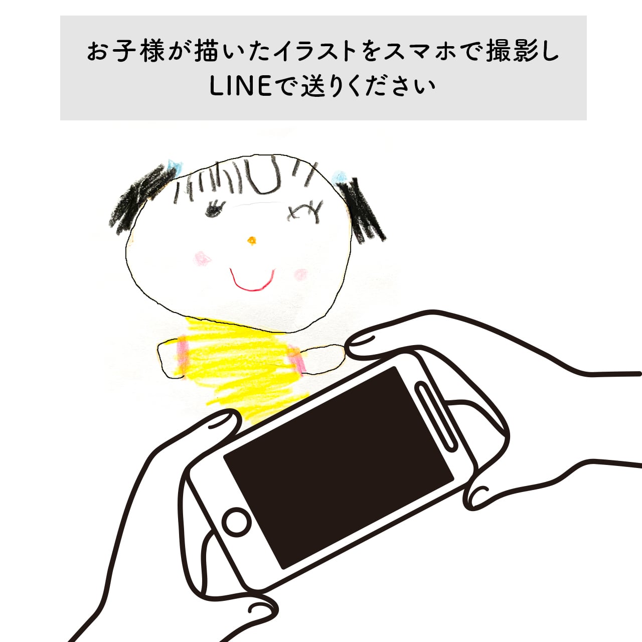 お子様が描いたイラストをスマホで撮影し、メッセージまたはLINEでお送りください。