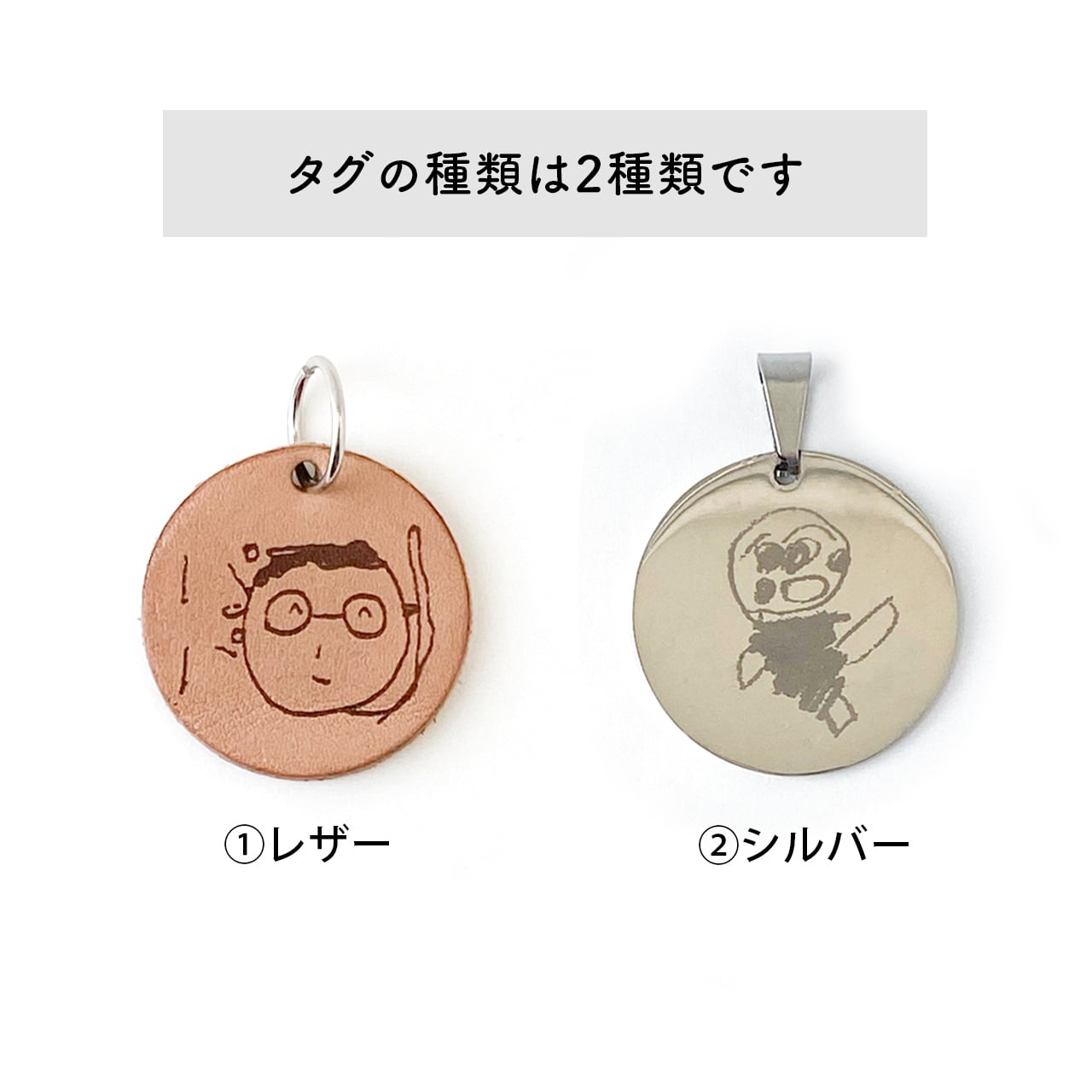 ※タグの種類はレザー、金属プレート(シルバー)の2種類です。